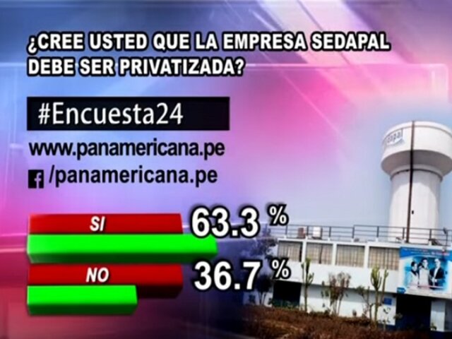 A la pregunta de este viernes en Encuesta 24: ¿Cree usted que la empresa Sedapal debe ser privatizada? un 63.3% respondió ‘SÍ’, mientras que un 36.7% contestó ‘NO’.