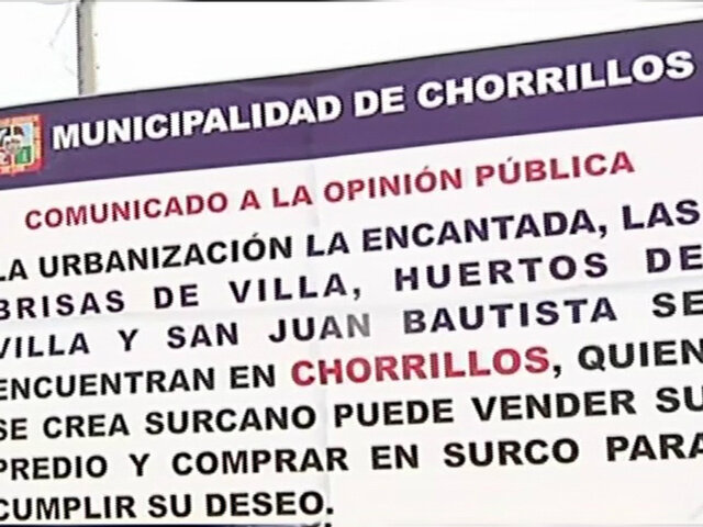 En el cartel se hace referencia que las urbanizaciones La Encantada, Las Brisas de Villa, Huertos de Villa y San Juan Bautista se encuentran en Chorrillos, y los vecinos que se sienta surcanos pueden vender su predio y comprar uno en Surco para cumplir su deseo.
