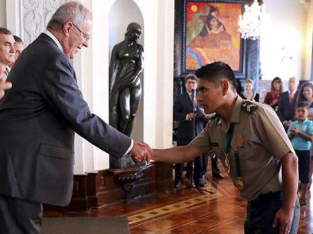 El presidente Pedro Pablo Kuczynski condecoró este martes al suboficial Lorenzo Machaca, quien abatió al asesino de cuatro personas en el distrito de Independencia. El mandatario destacó la valerosa acción del agente y lo felicitó por reaccionar en el momento oportuno y evitar más muertes inocentes. “Lo felicito por su coraje”, dijo PPK durante la ceremonia realizada en las instalaciones de Palacio de Gobierno.