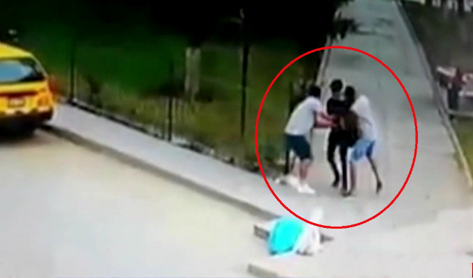 En las imágenes captadas por una cámara de seguridad del distrito, se observa como la banda de delincuentes observan a un estudiante caminando por un parque y se bajan para robarle sus pertenencias y escapan en el vehículo.