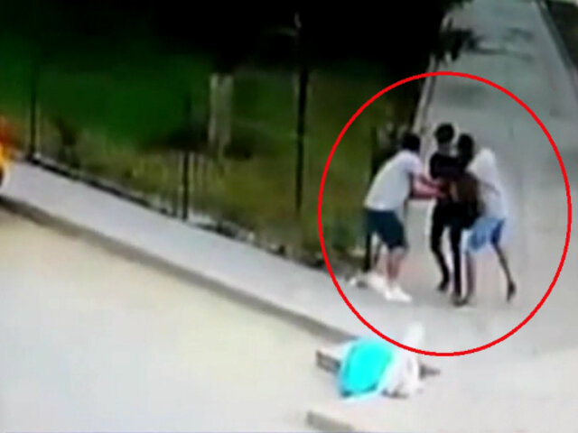 En las imágenes captadas por una cámara de seguridad del distrito, se observa como la banda de delincuentes observan a un estudiante caminando por un parque y se bajan para robarle sus pertenencias y escapan en el vehículo.
