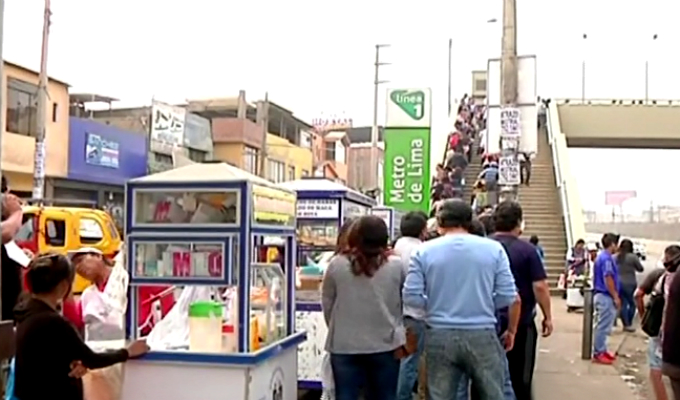 Los ambulantes apostados cerca de las estaciones de la Línea 1 del Metro de Lima, en San Juan de Miraflores, representan un serio peligro para los pasajeros, ya que bloquean las entradas y salidas de los paraderos.