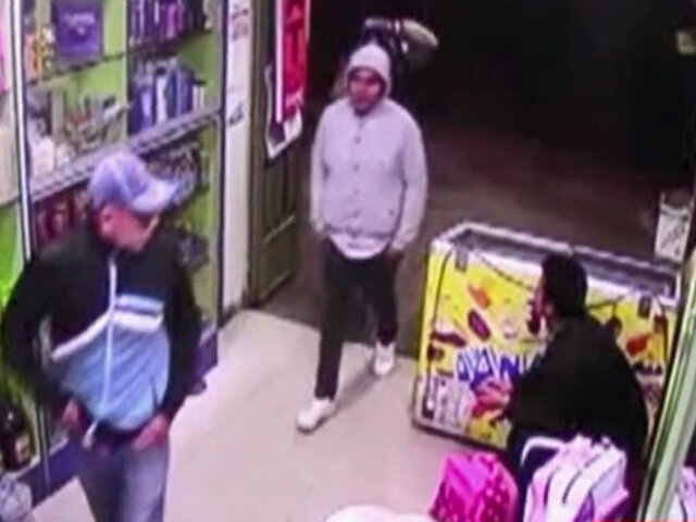 El robo se registró la noche del último domingo, en el distrito de Los Olivos, en las imágenes registradas por cámaras de seguridad se observa cuando tres sujetos irrumpen en el negocio que estaba próximo al cierre, fingiendo ser clientes, de pronto se distribuyen y uno se queda en la puerta mientras otro amenaza a una anciana que realizaba sus compras.