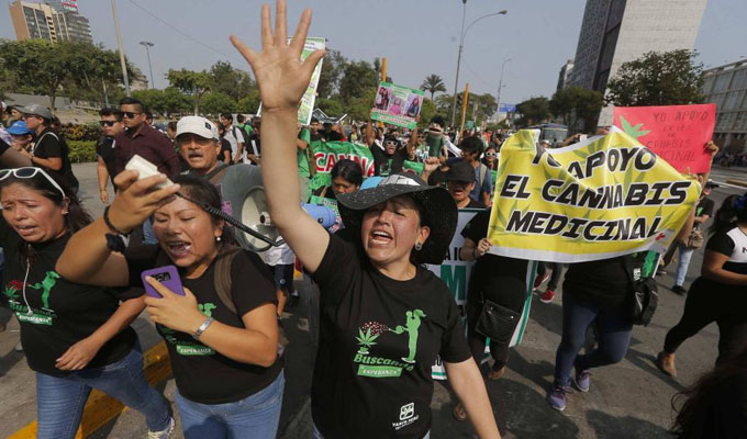 Esta tarde, cientos de personas marchan por diversas calles del Cercado de Lima para pedir la aprobación del proyecto de ley que autoriza el uso de la marihuana con fines medicinales a favor de pacientes con enfermedades crónicas.