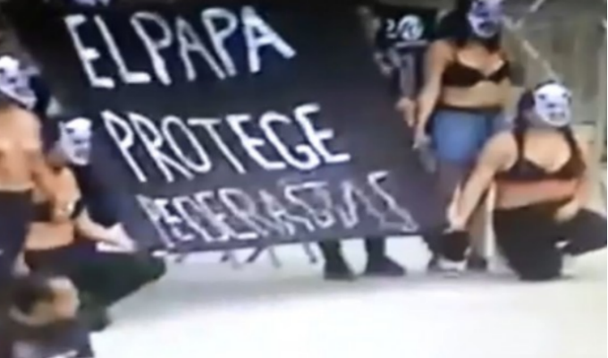 Como se muestra en imágenes, pese a que el grupo de mujeres pusieron resistencia a las autoridades, ellos les arrebataron su banderola que tenía como mensaje escrito: ‘El Papa protege pederastas’ y las retiraron del lugar.