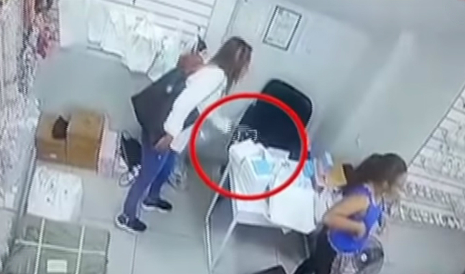 La vendedora, que estaba sentada en su escritorio, se retira por el llamado de una clienta de vestido floreado. Paralelamente, otras dos mujeres, parecen estar en actitud de comprar uno de los productos de la tienda, pero al parecer, ambas serían cómplices de la mujer de blusa blanca y estarían actuando como campanas.