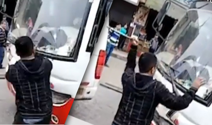 Como quedó registrado tras lograr su objetivo el cobrador no contentó con su acto, golpeo varias veces el parabrisas de la unidad.