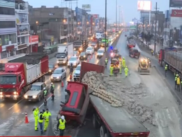 El cemento desperdigado generó gran congestionamiento vehicular. Este accidente se habría producido luego que el volquete haya impactado contra la verma central.