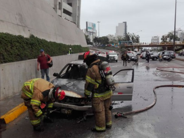 Aparentemente debido a un corto circuito en el sistema eléctrico, un auto se incendió en la bajada de Armendariz, Costa Verde. Un policía de la unidad de salvataje intentó sofocar el siniestro con un extintor, pero el fuego casi lo alcanza. Afortunadamente, el conductor, identificado como Esaú Guerrero Silva (60) fue rescatado a tiempo.