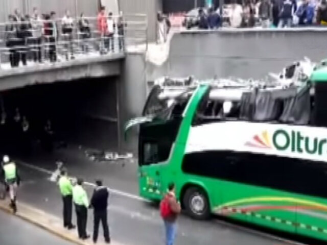 La inconsciencia del conductor de un bus estuvo a punto de causar una desgracia. Esta mañana el chofer Joselito Antonio Salcedo López intentó pasar por debajo del puente Villarán con un bus de la empresa Oltursa pero el techo de este vehículo impactó con la estructura, ya que las dimensiones del bus no eran aptas para esta vía.