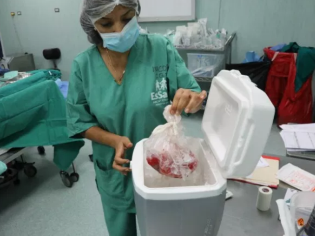 Como se muestra en imágenes, al interior de un cooler se encuentra el órgano protegido por un envoltorio plástico y recubierto por hielo, posteriormente los médicos lo extraen y se preparan para la cirugía de trasplante que duró más de 6 horas.