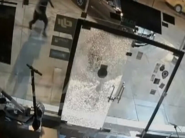Eficaz e impactante fue la maniobra usada por unos delincuentes para abrirse paso e ingresar a una costosa tienda de productos tecnológicos, en el distrito de Surco. Dos sujetos encapuchados y con guantes, lanzan con todas sus fuerzas un objeto desconocido para dejar la puerta hecha pedazos.