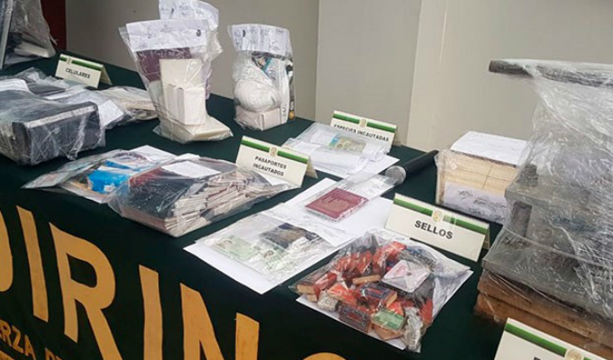 La Policía halló en su poder 60 pasaportes, impresoras, sellos, seis celulares y 40 bolsas de marihuana.