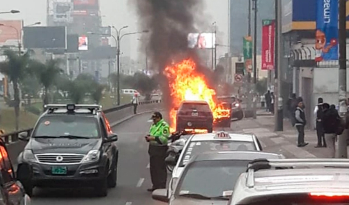 Un automóvil se incendió esta mañana en la cuadra 29 de la avenida Javier Prado, en San Borja. Dos unidades del Cuerpo General Bomberos llegaron al lugar para controlar las llamas. No se ha reportado ningún herido.