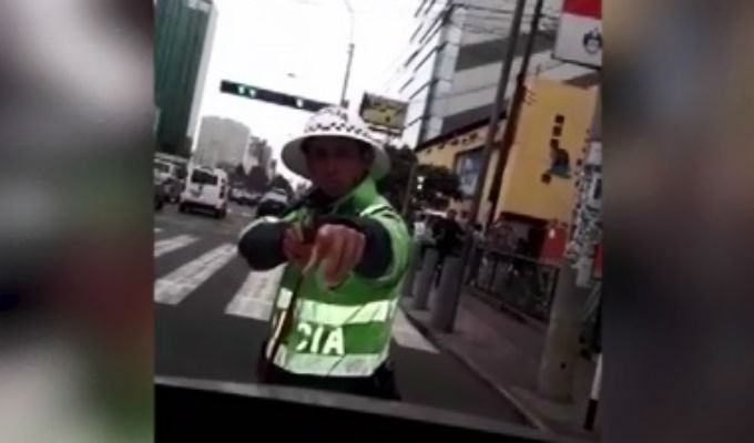 Pánico en las pistas de Lima. Un policía de tránsito apuntó con su arma de reglamento a un conductor, luego de que este se resistiera a una intervención en el cruce de las avenidas Javier Prado y Petit Thouars, en San Isidro.