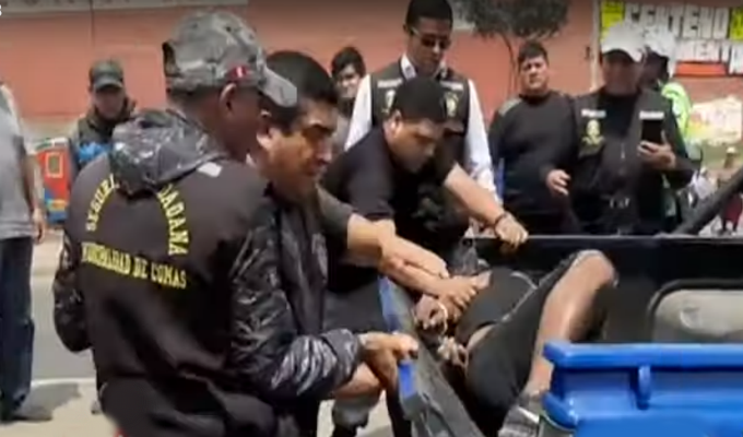 Un sujeto fue intervenido cuando estaba desmantelando un tráiler que había sido estacionado en el cruce de las avenidas Túpac Amaru en Comas. Como se observa en las imágenes, el ladrón en flagrancia intentó a toda costa ser detenido por el personal de Serenazgo del distrito a quienes amenazó con cortarles el cuello.