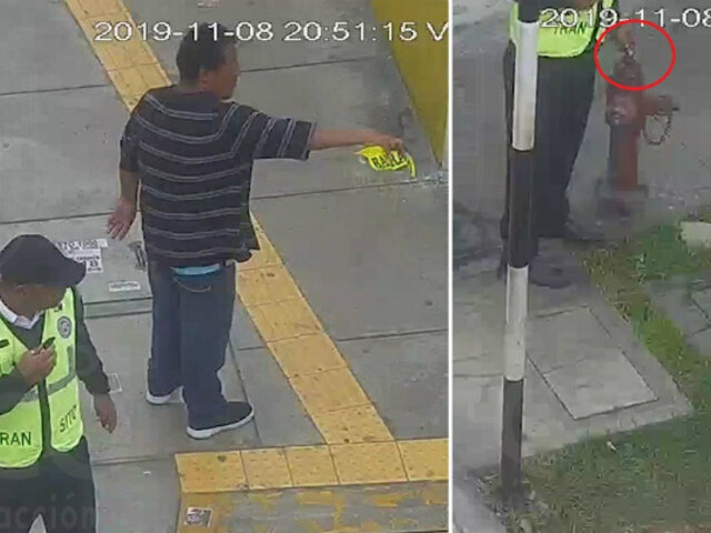 Dos inspectores de Tránsito que portaban un chaleco amarillo fueron captados en el preciso instante cuando recibían coimas de un 'jalador' de colectiveros informales. Los trabajadores que tenían un mes en la Municipalidad de Santiago de Surco fueron identificados como Rafael Soria Salazar y Oscar Ramos Salazar.