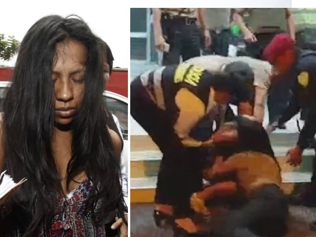 Imágenes muestran cómo la iracunda mujer, en aparente estado de ebriedad, agarra de los cabellos y tira al suelo a la suboficial cuando era llevada a la sede policial.