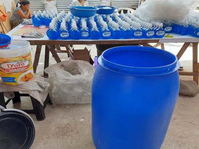 Las autoridades también confiscaron cuatro bidones de color azul, tres de ellos con productos gelatinosos transparentes con la etiqueta ácido fosfórico, entre otros insumos.