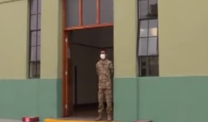 Los reservistas ingresan nuevamente a realizar el servicio militar, las autoridades le miden la temperatura y posteriormente tienen deben ingresar y colocar el calzado en plataformas que tienen desinfectantes.
