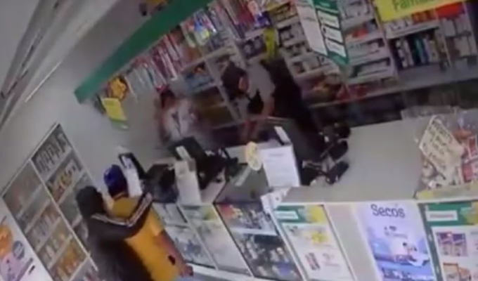 Cámaras de seguridad captaron el preciso momento en que los hampones ingresaron con arma en mano y amenazaron a los trabajadores de la cadena de farmacias. Ellos también robaron alcohol en gel, mascarillas y teléfonos celulares.