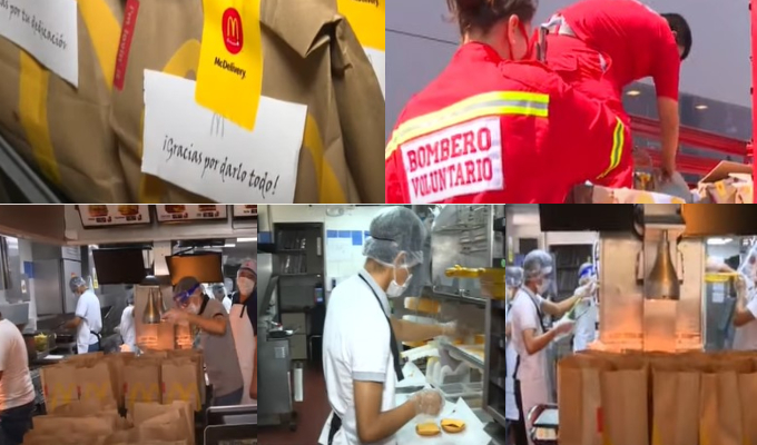 Ante el arduo trabajo que vienen cumpliendo agentes de la Policía Nacional, miembros del Cuerpo General de Bomberos Voluntarios del Perú y personal del Ejército, la cadena de comida rápidas Mcdonald’s viene repartiendo miles de combos diarios.