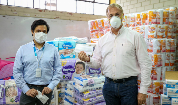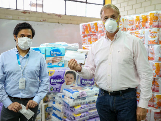 "Esta herramienta es un elemento indispensable de protección para todos", resaltó el alcalde de Lima, Jorge Muñoz. Además, informó que la donación también incluyó 163 paquetes de pañales Babysec, 2,400 de papel toalla Nova Clásica y planchas de papel higiénico Elite Premium.