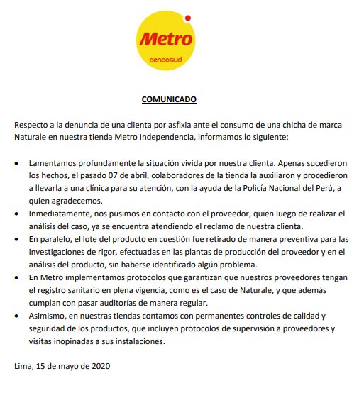 La cadena de supermercados Metro emitió un comunicado este 15 de mayo, donde indicó que el proveedor ya se encuentra atendiendo el reclamo de la clienta y el lote del producto fue retirado preventivamente para las investigaciones.