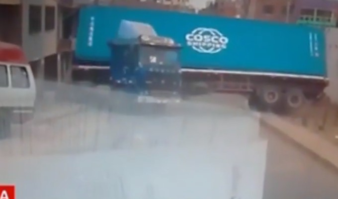 La mala maniobra del conductor de un trailer casi provoca un fatal accidente en la calle Ascope, en el Cercado de Lima, tras desprenderse el contenedor que trasladaba.