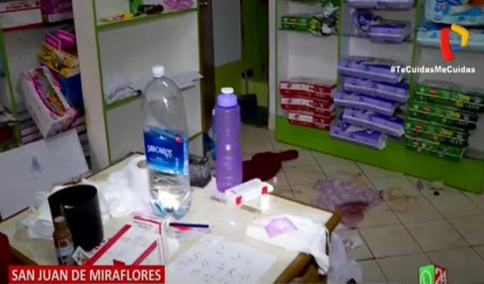 En San Juan de Miraflores, dos delincuentes ingresaron a una farmacia y atacaron a la dueña del establecimiento por intentar impedir el robo de los 10 mil soles que tenía guardado en la caja registradora.