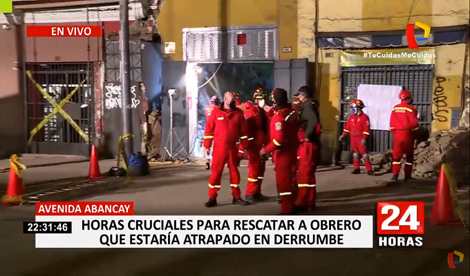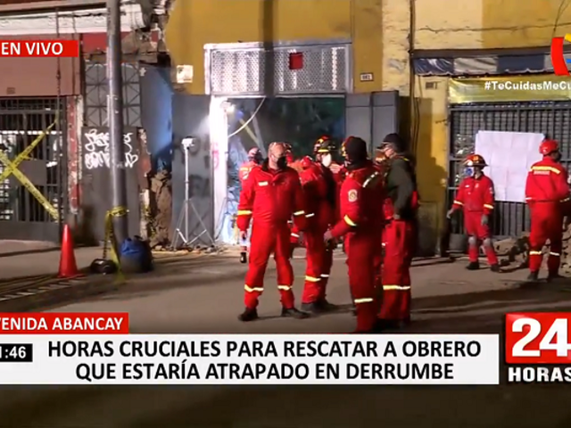 Más de 100 voluntarios del Cuerpo General de Bomberos, siguen trabajando por más de 30 horas en labores de rescate en la avenida Abancay, para ubicar con vida al obrero de 53 años que quedó atrapado tras derrumbarse una casona en el Centro de Lima el último sábado.