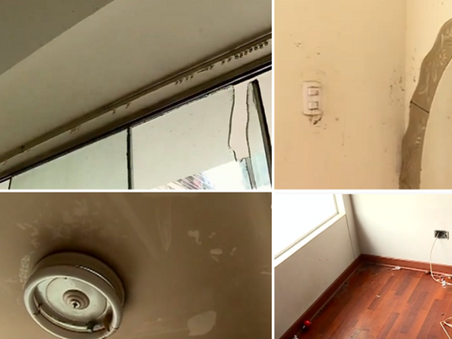 “Así no estaba el departamento, se entregó en buenas condiciones. Mira el techo cómo está, que es un dormitorio, está en las peores condiciones. Acá es otra habitación, acá vemos una lámpara que está toda rota”, señaló Ronald Callirgos.