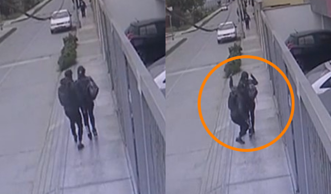 El hecho delictivo quedó registrado por las cámaras de seguridad, y se observa el instante cuando un sujeto con mochila corre hacia ella y le roba el celular que tenía en la mano.