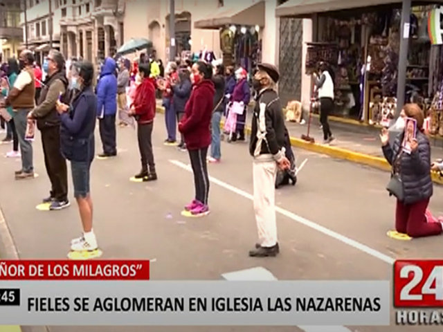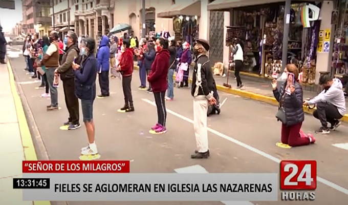Sin temor al COVID-19, decenas de fieles se presentaron desde temprano a la iglesia Las Nazarenas para orar al Señor de los Milagros. Muchos aparecieron con los tradicionales hábitos morados, portando velas y otros oraban de rodillas. La Policía y miembros del Monasterio del Señor de los Milagros organizaron a los creyentes para que entren a rezar solo cinco minutos, sin embargo, se recomienda a la población que celebren esta fecha desde sus hogares.