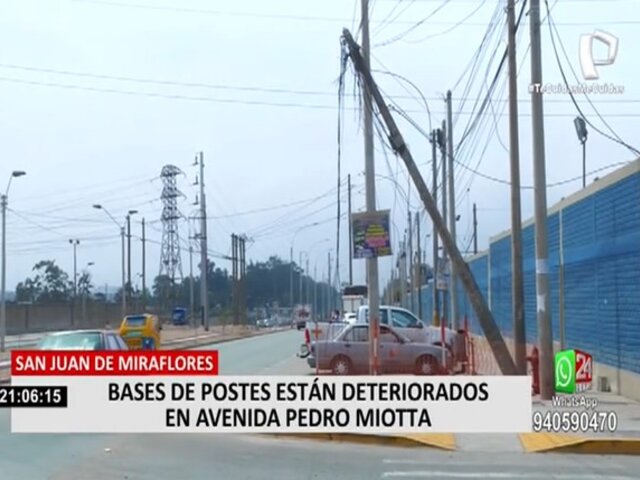 En el cruce del jirón Calango con la avenida Pedro Miotta, en el distrito de San Juan de Miraflores (SJM), se encuentra un poste que prácticamente está sostenido por los cables de telefonía.