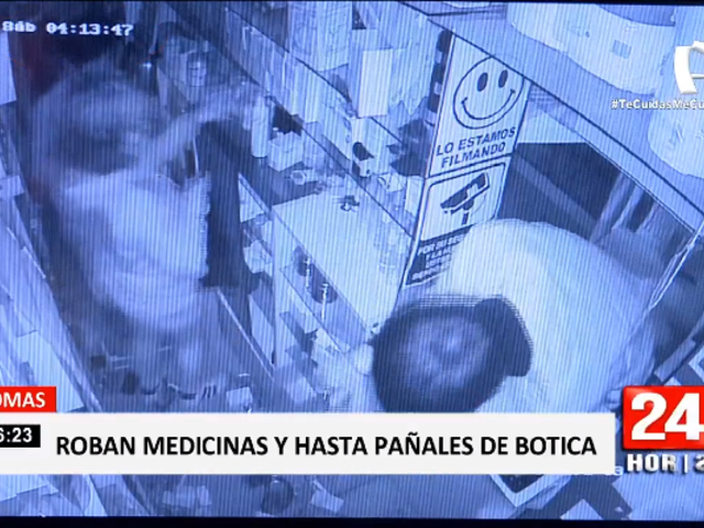 Se observa cómo uno de ellos se va y trae una caja de cartón y empieza a meter todo lo que encuentra, desde pastillas, shampoos, jabones, crema dental y todo lo que tiene a su disposición. Mientras que, una mujer abre la caja registradora y busca dinero, su cómplice ingresa a un espacio y también revisa los productos.