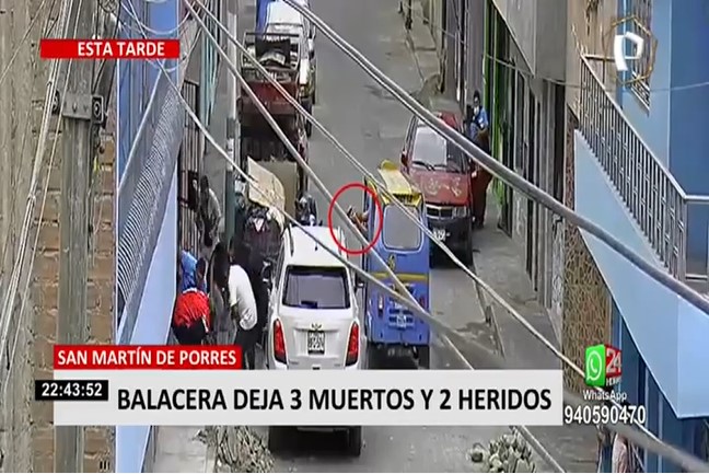 Este lunes, un sujeto que iba a bordo de un mototaxi asesinóa balazos a tres hombres que conversaban en la calle Las Lilas, en el distrito de San Martín de Porres. Este hecho quedó registrado por una cámara de seguridad de la zona.