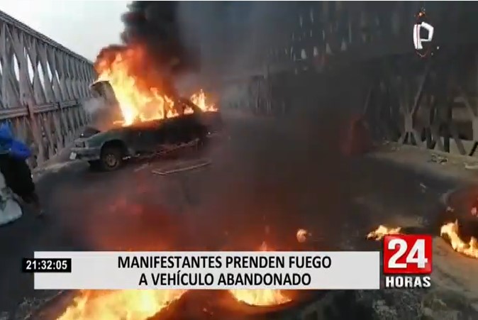 Por ejemplo, en el Puente Virú, un grupo de manifestantes prendieron fuego a un vehículo abandonado, lo que impidió el tránsito por dicha plataforma.