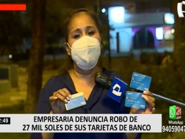 Una empresaria, identificada como Soledad Araujo Galindo, denunció que le robaron más de 20 mil soles de sus cuentas bancarias. La víctima indicó que habría sido víctima de delincuentes informáticos, quienes le sustrajeron todo ese dinero a través de sus tarjetas.
