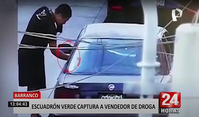 Jair Reátegui Silva (25) fue registrado en un video donde se le observa realizando acciones sospechosas en la cuadra 2 del jirón Talania en Barranco, de acuerdo a la policía, estaba vendiendo marihuana y clorhidrato de cocaína, además tenía 54 bolsitas de marihuana y 49 de cocaína.