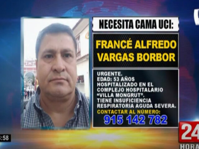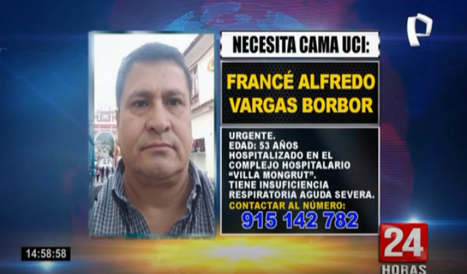 La familia de Francé Alfredo Vargas Borbor, de 53 años de edad, hizo un pedido de ayuda a través de 24 Horas Edición Mediodía para encontrar una cama UCI para este hombre, que padece un cuadro grave de covid-19.