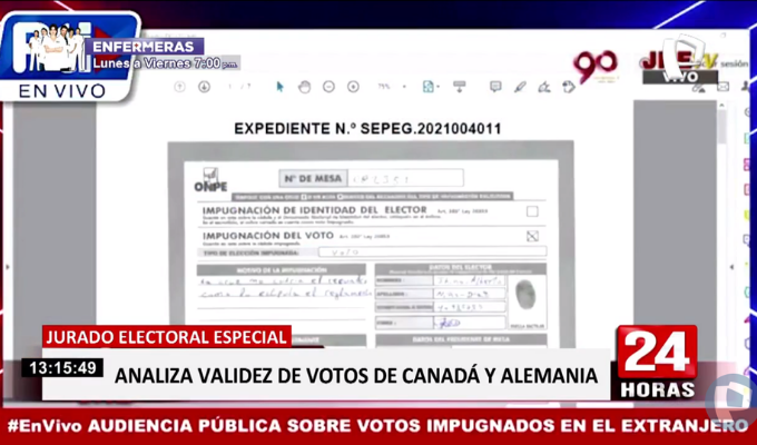 Las audiencias públicas continúan en el Jurado Electoral Especial Lima Centro 1 por los votos impugnados por parte de Fuerza Popular (FP) y Perú Libre (PL). Esta vez se analizó la validez de los votos provenientes de Canadá y Alemania.