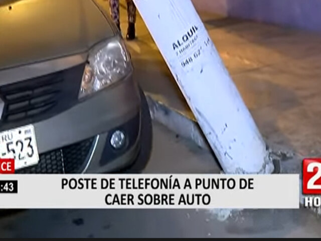 En Lince, un poste de telefonía se encuentra apunto de caer sobre un vehículo. El dueño del auto, César Cama, señaló que el poste se encuentra roto desde horas de la mañana.