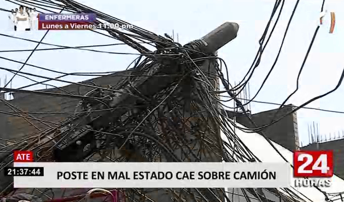 El conductor de un camión se salvó de morir, luego que un poste cayera sobre su unidad en movimiento. Este accidente se registró en la calle Mar Caribe, frente al parque El Porvenir, en el distrito de Ate.