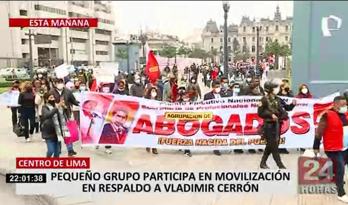 La movilización encabezada por el secretario del partido Perú Libre Yuri Castro, recorrió 4 cuadras del Jirón de la Unión hasta llegar a los exteriores de Palacio de Justicia, donde presentaron un pronunciamiento dirigido al presidente del Poder Judicial de parte de la agrupación de abogados del partido PL.