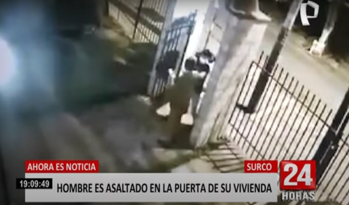 En las imágenes se observa como uno de los delincuentes baja de una motocicleta y lo aborda en la puerta de su vivienda y lo encañona con una pistola.