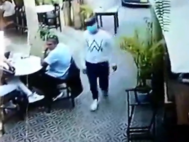 En las cámaras de seguridad del local se observa cómo un mesero lo ve, mientras que el delincuente se da la vuelta, se levanta la camiseta y saca un arma de fuego que escondía ensu cintura, un revolver con el que apuntó al trabajador y a su víctima, directamente al cuerpo.
