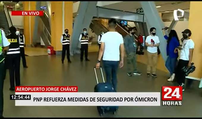 La Policía Nacional viene reforzando las medidas de bioseguridad en el Aeropuerto Internacional Jorge Chávez ante la alerta de la presencia de una variante del Covid-19 denominada como Ómicron.