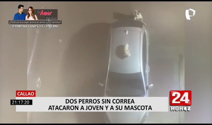 En imágenes captadas por cámaras de seguridad se observa como un joven tuvo que subir a su pequeño perro al techo de un auto para protegerlo de dos feroces pitbulls. El hecho ocurrió en la cuadra 11 de la avenida Morales Duarez en Carmen de la Legua en el Callao.