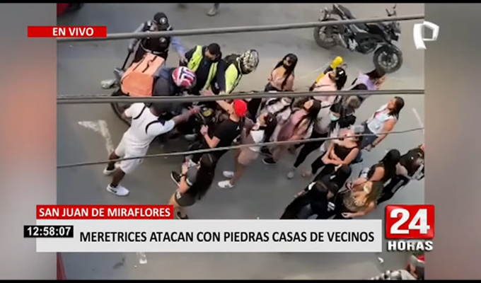 En las imágenes captadas se observa que, tras la llegada de los serenos del distrito, una decena de mujeres, presuntamente meretrices, agreden a las autoridades.